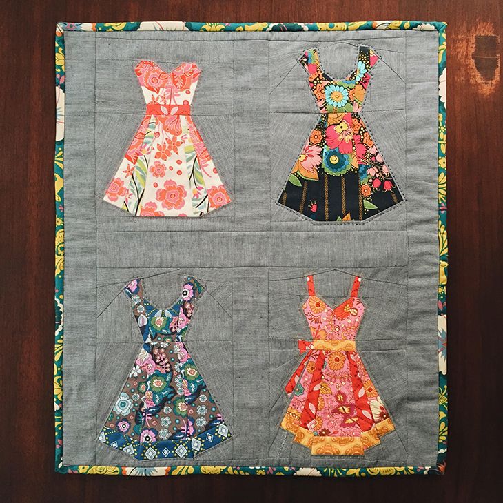 For my second quilt swap, I got a little more ambitious. I fell in love with this vintage dress pattern and thought it would be perfect for the Anna Maria Horner florals. I had so much fun coordinating the fabrics, fussy cutting the prints and building these darling little dresses. The quilting was a simple hand stitch in a matching color a quarter inch outside of the dress outline.